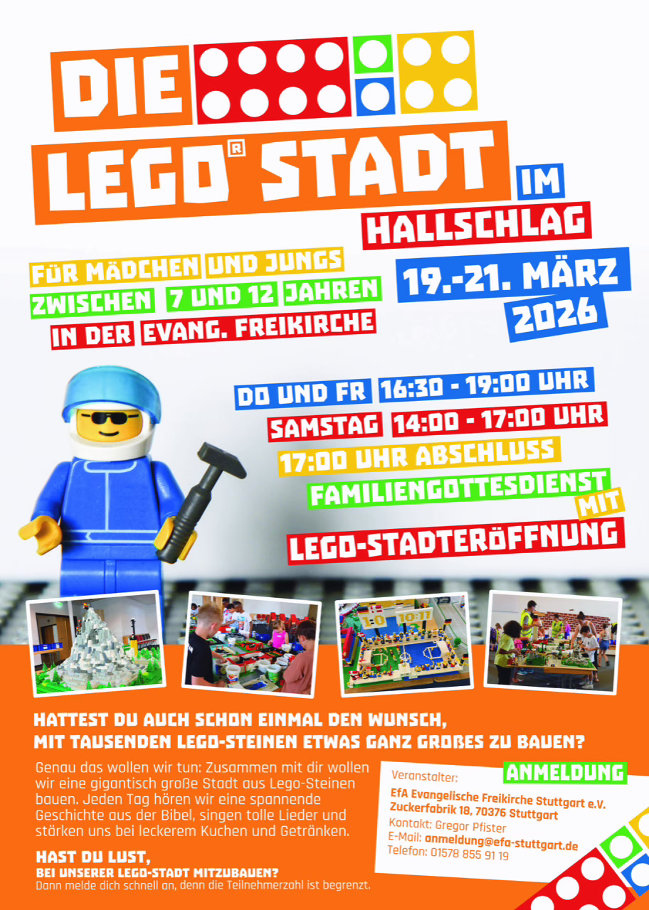 Genau das wollen wir tun: Zusammen wollen wir eine gigantisch große Stadt aus LEGO-Steinen bauen. Jeden Tag hören wir eine spannende Geschichte aus der Bibel, singen tolle Lieder und stärken uns bei leckerem Kuchen und Getränken.